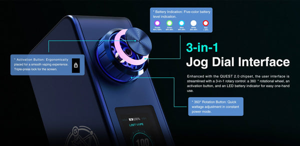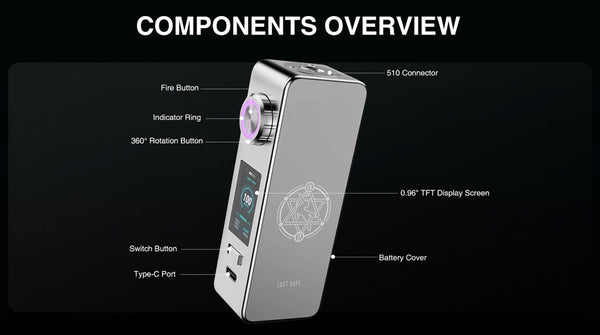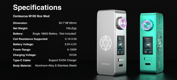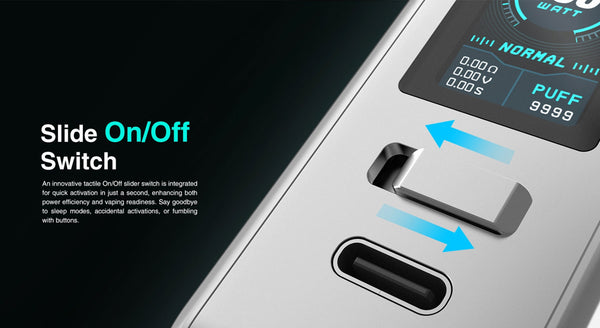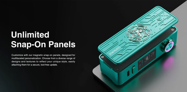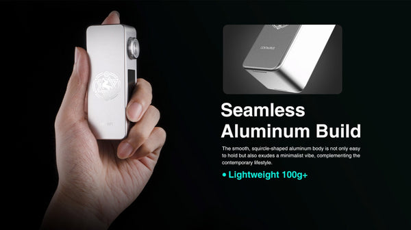 This mod is adorned with sublime engravings that give it a professional, elegant look. With up to 100 watts of power, adjustable via a knob on the switch, it offers a powerful, personalized vaping experience. It runs on an 18650 battery (not included), offering ample autonomy for prolonged use. What's more, it features a fast-charge function via USB type-C, allowing users to quickly recharge their mod to enjoy uninterrupted vape.