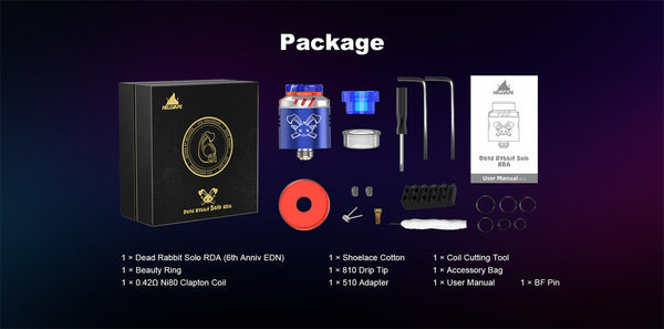 يتميز جهاز Hellvape DEAD Rabbit Solo RDA بقطر 22 مم، وقاعدة ملف واحد، ومدخل تدفق هواء 30 قرص عسل، وهو مناسب جدًا لمحبي التحكم في تدفق الهواء من خلال حلقة تدفق الهواء. توجد حلقة التحكم المرنة في تدفق الهواء على الجانب، مما يتيح لك التبديل من RDL إلى MTL. وهو مزود بطرف تنقيط من الراتنج بلون 810 ومحول 510 (موصل مع أطراف التنقيط 510). مع دبوس BF Squonk، يكفي جهاز Dead Rabbit Solo RDA لاستيعاب أي جهاز Squonk تقريبًا، مثل جهاز Wotofo Profile وجهاز Vandy Vape Pulse V2 BF، إلخ.