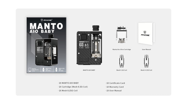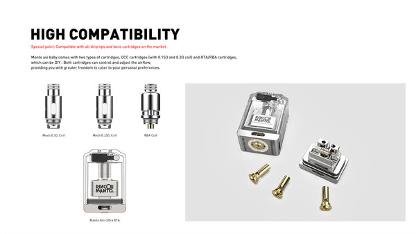 Manto aio baby comes with two types of cartridges, OCC cartridges( with 0.15ohm and 0.3ohm coil ) and RTA / RBA cartridges . which can be DIY . Both cartridges can control and adjust the airflow providing you with greater freedom to cater to your personal preferences.Compatible with all drip tips and boro cartridges on the market.