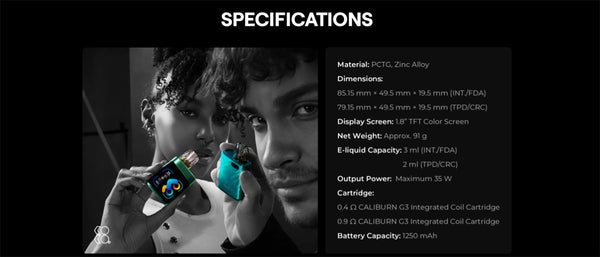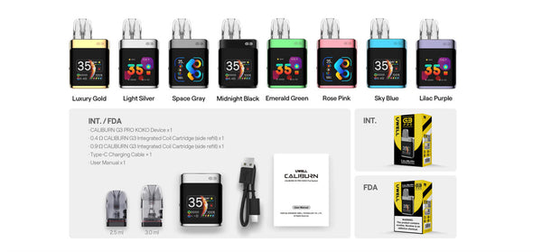 صُمم لتلبية متطلبات الباحثين عن الأداء العالي، ويتميز بشاشة TFT عملاقة مقاس 1.8 بوصة لتجربة بصرية مذهلة، وبطارية احترافية بسعة 1250 مللي أمبير/ساعة تتفوق على مثيلاتها، مع إمكانية تخصيص غير محدودة تُمكّنك من اختيار أوضاع التبخير المُناسبة لك. يأتي CALIBURN G3 PRO KOKO مع خرطوشة سعة 3 مل - 0.4 أوم وقوة إخراج قصوى تبلغ 35 واط، ليمنحك تجربة تبخير RDL قوية. مع لمسة نهائية معدنية تُضفي لمسة من الفخامة، و8 ألوان أنيقة تُعبّر عن شخصيتك، انضم إلى عائلة KOKO بأناقة!