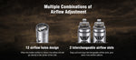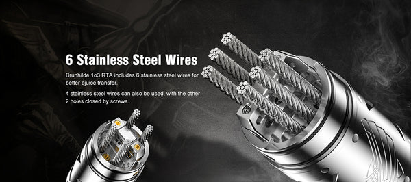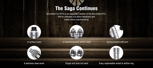 جهاز Vapefly Brunhilde 1o3 RTA هو النسخة المُحسّنة من جهاز Brunhilde RTA. عند إغلاق فتحة تدفق الهواء السفلية، سيستمر تدفق الهواء مباشرةً إلى مركز الملفات بفضل تصميمه المُكوّن من 12 فتحة. بالإضافة إلى ذلك، يحتوي الجهاز على فتحتي تدفق هواء قابلتين للتبديل لتوفير خيارات أكثر للمستخدمين. سيمنحك تدفق الهواء المحيط بزاوية 360 درجة نكهة رائعة. لضمان نقل أفضل للسائل الإلكتروني، صُمم جهاز Brunhilde 1o3 RTA بستة أسلاك من الفولاذ المقاوم للصدأ. يدعم جهاز Brunhilde 1o3 RTA سطح ملف واحد أو ملفين. لا داعي للقلق بشأن التسرب من فتحة التعبئة مع نظام إعادة التعبئة الجانبية المُحسّن المزود بنابض.